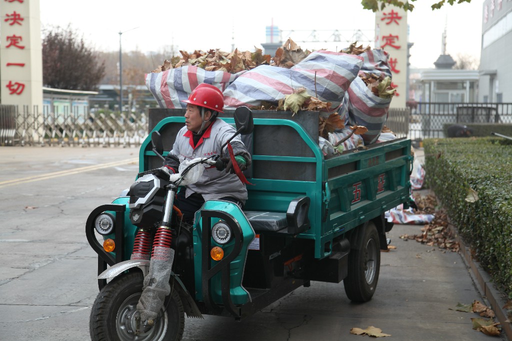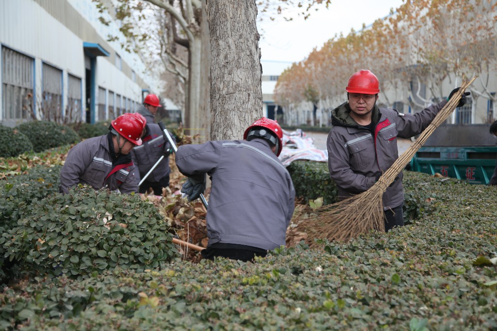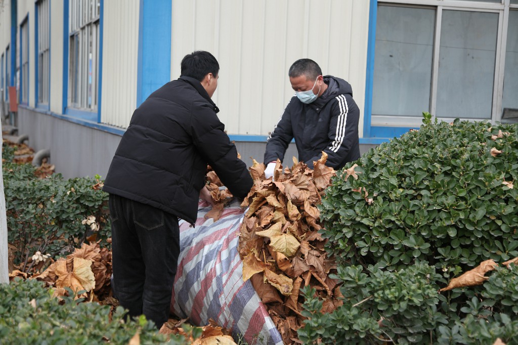 大家拿着扫帚 、耙子等工具 ,不畏严寒,热情高涨。有的员工挥舞着扫把 ,奋力地将落叶扫成一堆;有的走进冬青丛中 ,一点一点地将落叶清理出来;有的开着新能源三轮车 ,来回穿梭,将落叶集中运送清理。在清扫过程中,大家相互配合,默契十足。欢声笑语在园区内回荡,驱走了冬日的寒冷 。